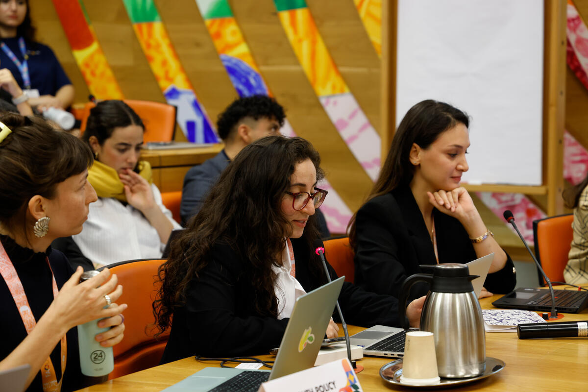 15 October 2025. FAO Headquarters, Rome, Italy. Elif Menderes (R), Shalala Hasanova (C) and Sarah Kohane (L), members of Europe and Central Asia Youth Policy Board, at the Europe and Central Asia Roundtable of the Youth Assembly during the World Food Forum 2025.