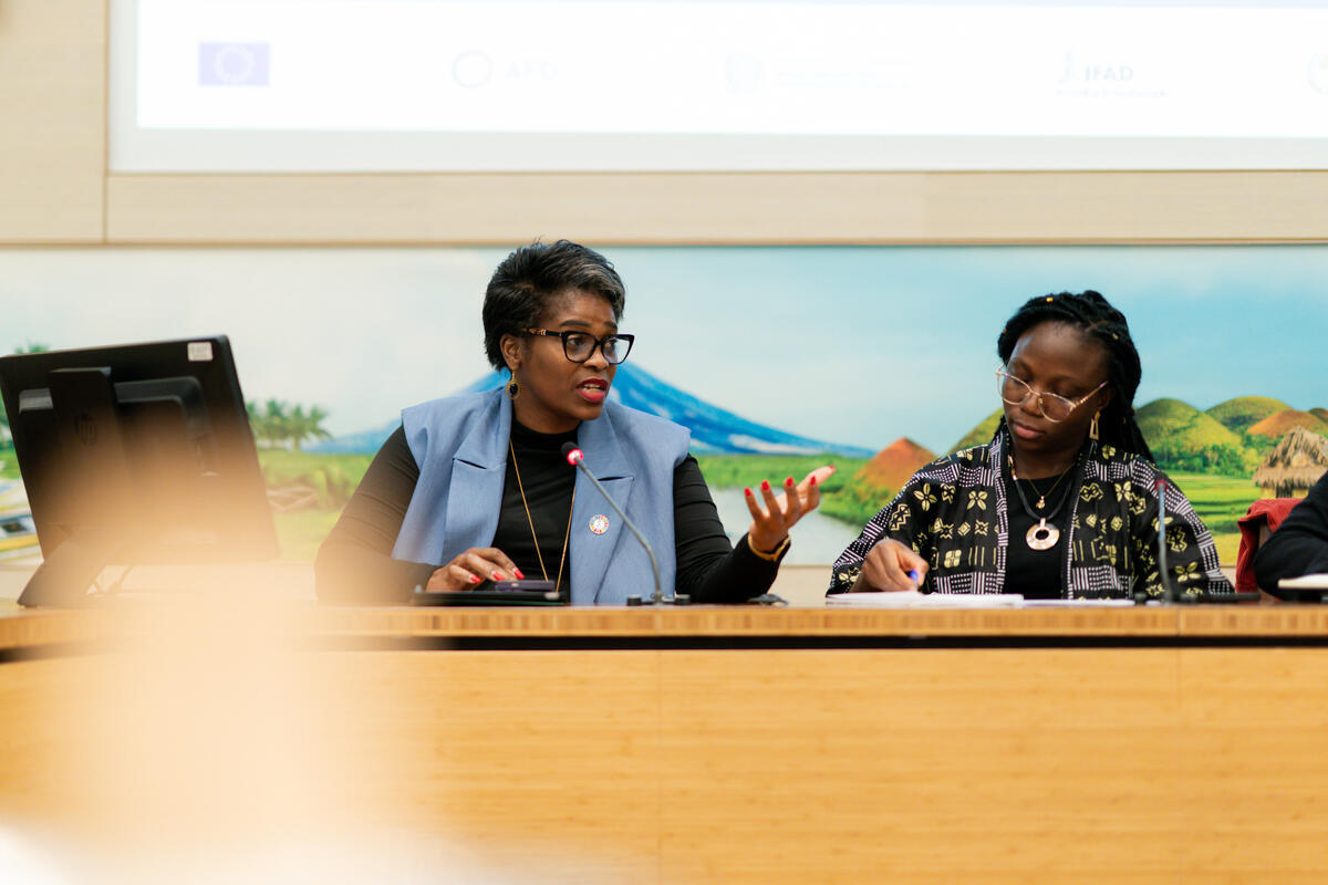 15 October 2025. FAO Headquarters, Rome, Italy. Youth in Action_ Driving Innovation and Technology for Sustainable and Risk-Smart Agriculture. Brenda Mulele Gunde (Lead Global Technical Specialist, ICT for Development, IFAD) with Mahoussi Simone Assocle (Biodiversity and Climate Specialist, IFAD) at the session.