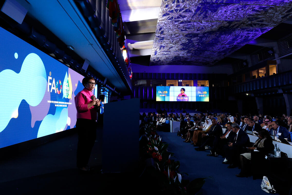 15 October 2025, Rome, Italy. Retno L.P. Marsudi, UN Secretary-General’s Special Envoy on Water delivers her address during the World Food Forum (WFF) 2025. The fifth edition of the World Food Forum (WFF), the largest annual gathering of agrifood systems stakeholders globally, runs at FAO headquarters in Rome from 10 to 17 October 2025. FAO Headquarters, (Plenary Hall).