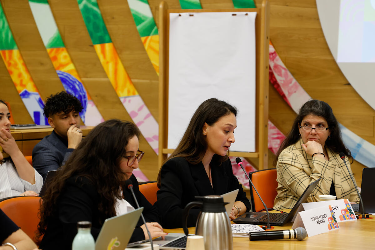 15 October 2025. FAO Headquarters, Rome, Italy. Jennifer Solotaroff (R), Sr. Social Development Specialist and ECA Gender Coordinator at World Bank, Elif Menderes (C), Europe and Central Asia Youth Policy Board member, and Shalala Hasanova (L), Europe and Central Asia Youth Policy Board member, at the Europe and Central Asia Roundtable of the Youth Assembly during the World Food Forum 2025.
