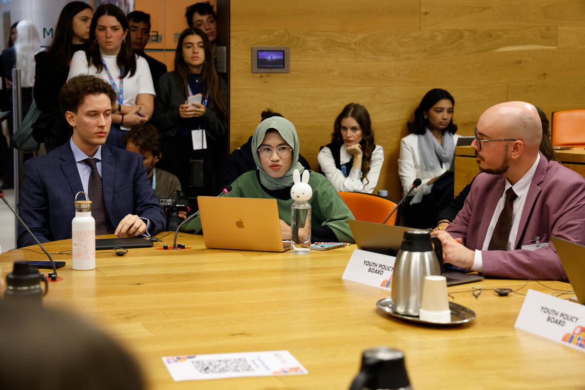 15 October 2025. FAO Headquarters, Rome, Italy. Pierpaolo Brogelli (L), Academic Delegate from LUISS, and Inaya Zafira (C), Academic Delegate from WUR, and Alexandros Tataridas (R), Europe and Central Asia Youth Policy Board member, at the Europe and Central Asia Roundtable of the Youth Assembly during the World Food Forum 2025.