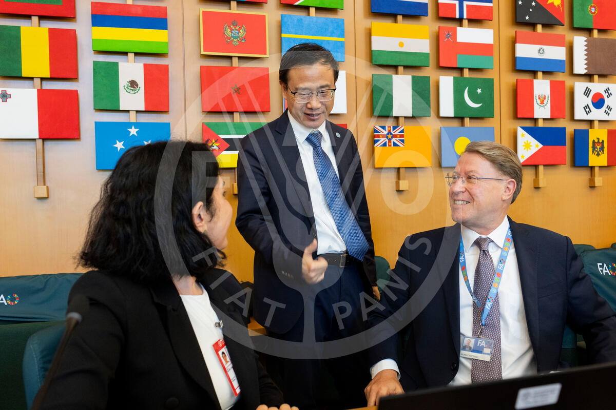 20 May 2025, Rome, Italy. Mr Xinhua Yuan (C) Deputy Director NFI, Ms Burcu Bilgin Topçu Chair COFI (L) and Mr Matthias Halwart (R) Secretary COFI during the13th Sub-Committee on Aquaculture, COFI, afternoon session. FAO Headquarters (Green Room).