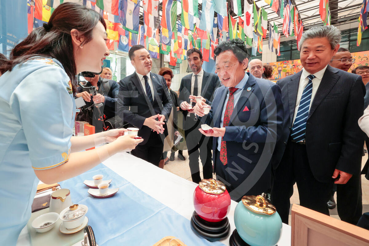 21 May 2025. Rome, Italy. FAO Director-General QU Dongyu, next to Zhang Lubiao, Ambassador, Permanent Representative of China to the UN Agencies for Food and Agriculture, (R) visits the China stand during the celebration of the International Tea Day 2025. FAO headquarters, (Atrium).