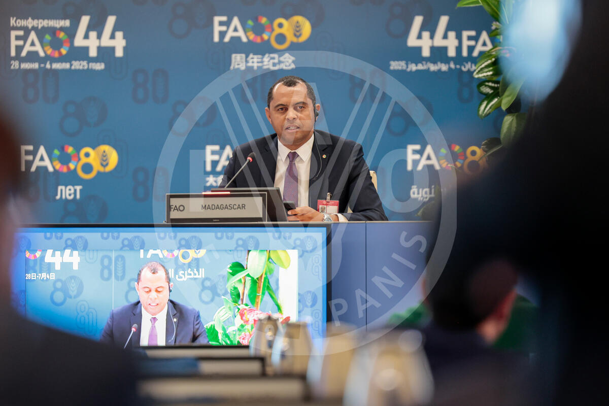30 June 2025, Rome, Italy. FAO Minister for Agricolture and Livestock Madagascar Francois Sergio Hajarison delivers his statement during the 3rd day of the 44th Session of the FAO Conference. FAO Headquarters (Plenary Hall).