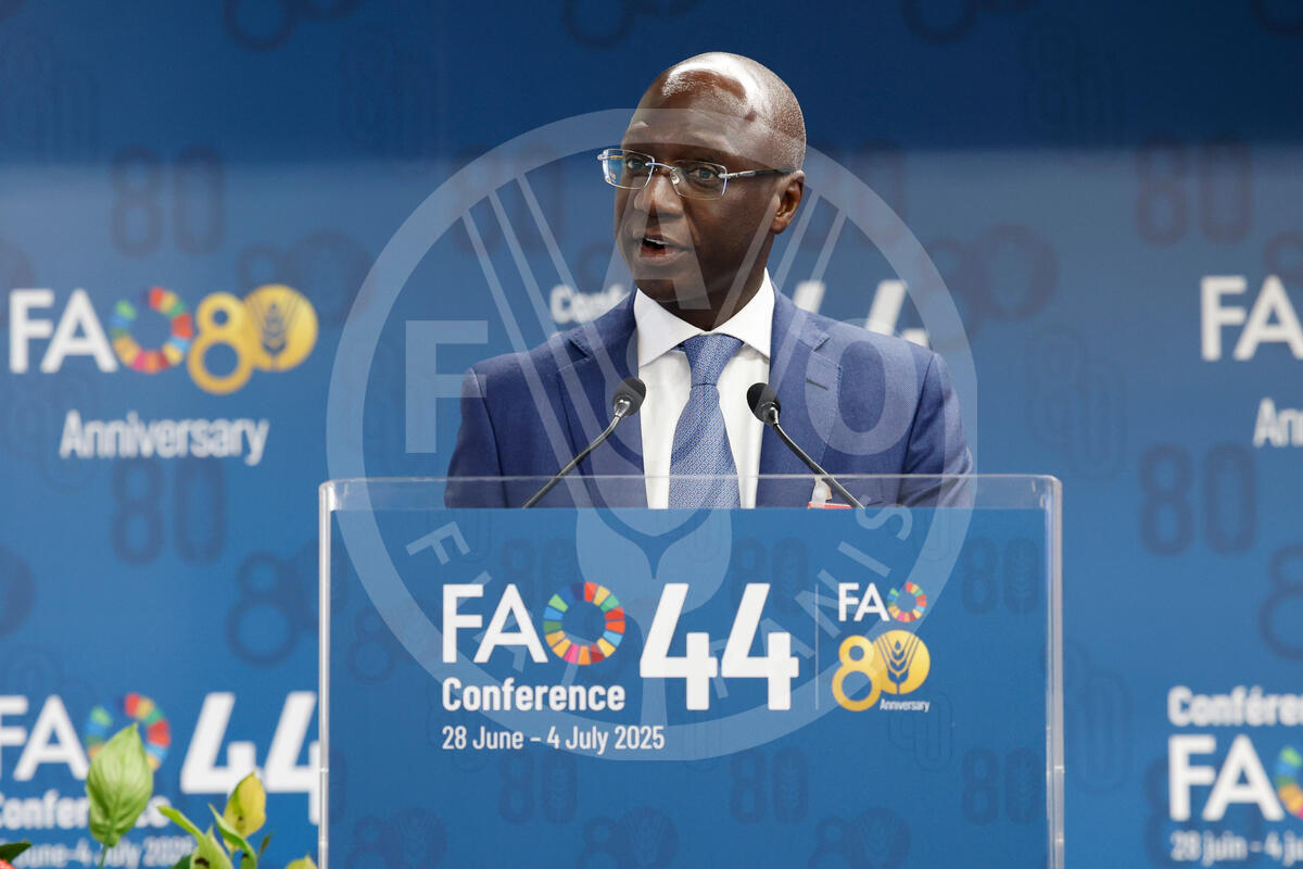30 June 2025, Rome, Italy. Mabouda Diagne, Minister of Agriculture, Senegal, Chairperson of Conference delivers his statement during the 3rd day of the 44th Session of the FAO Conference. FAO Headquarters (Plenary Hall).