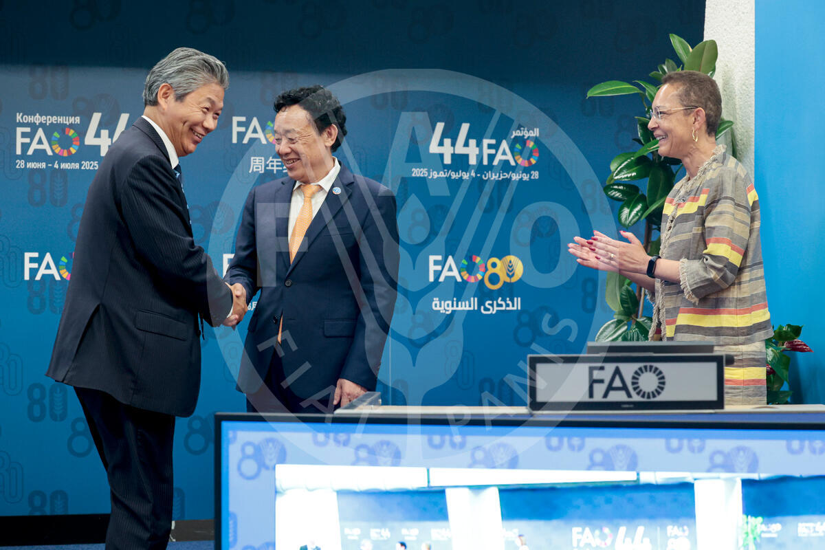 30 June 2025, Rome, Italy. Zhang Lubiao, Ambassador and Permanent Representative of the People’s Republic of China to FAO, (L) shakes hands with FAO Director-General QU Dongyu as Donata Rugarabamu, FAO Legal Council, claps, during the Inaugural FAO Treaty Ceremony on the 3rd day of the 44th Session of the FAO Conference. FAO Headquarters (Plenary Hall).