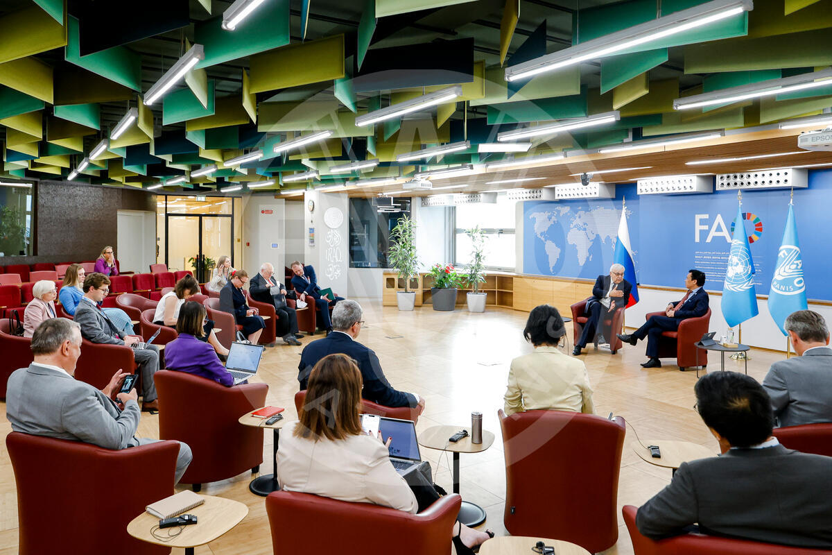 01 July 2025. Rome, Italy. FAO Director-General QU Dongyu meets Russia Deputy Minister for Foreign Affairs, Sergey Vershinin. FAO headquarters, (Iraq room).
