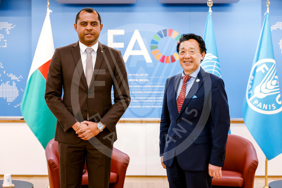 01 July 2025. Rome, Italy. FAO Director-General QU Dongyu meets Madagascar Minister for Agriculture and Livestock, François Sergio Hajarison. FAO headquarters (Iraq room).