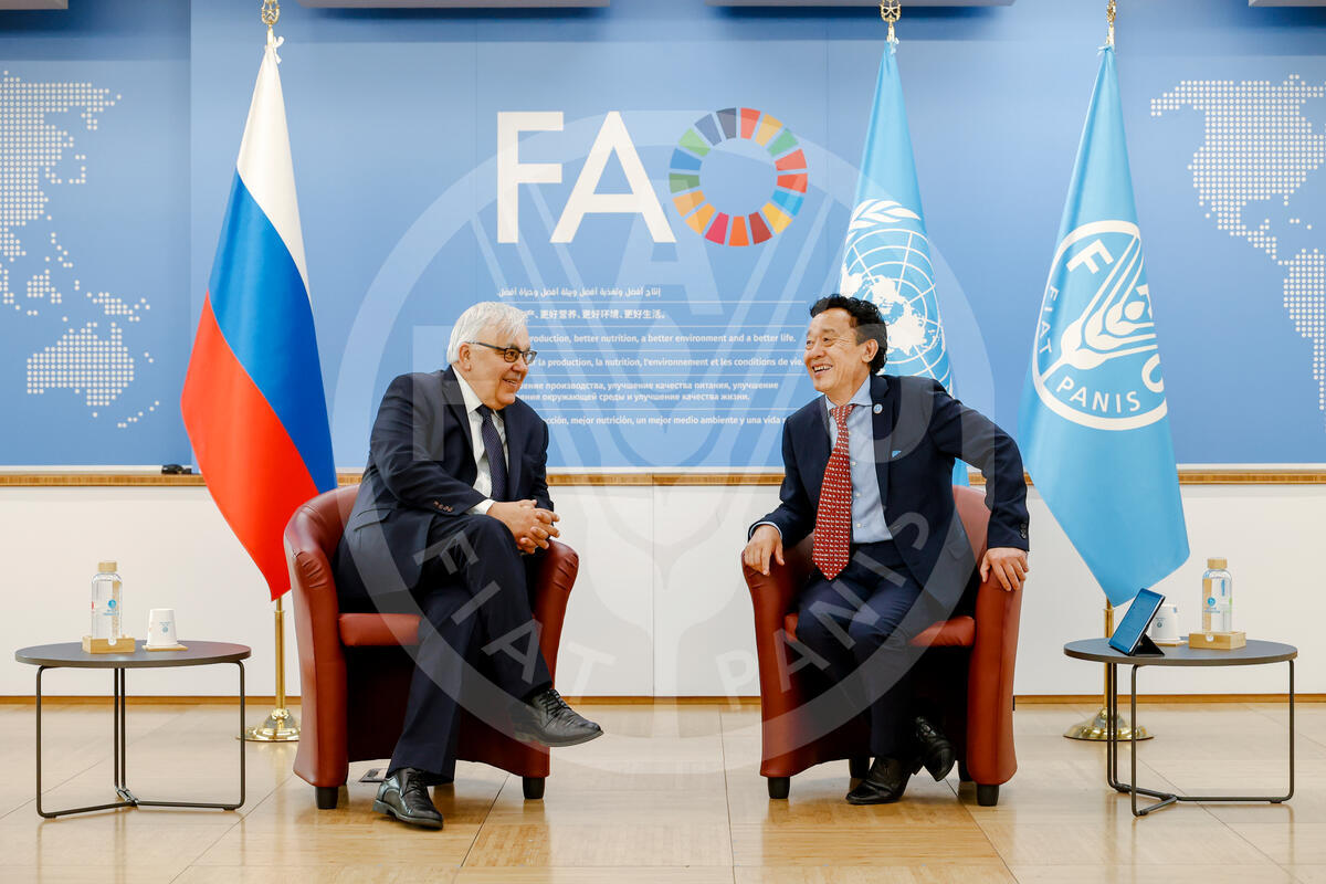 01 July 2025. Rome, Italy. FAO Director-General QU Dongyu meets Russia Deputy Minister for Foreign Affairs, Sergey Vershinin. FAO headquarters, (Iraq room).