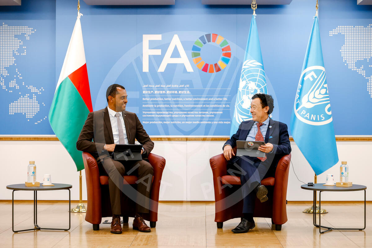 01 July 2025. Rome, Italy. FAO Director-General QU Dongyu meets Madagascar Minister for Agriculture and Livestock, François Sergio Hajarison. FAO headquarters (Iraq room).