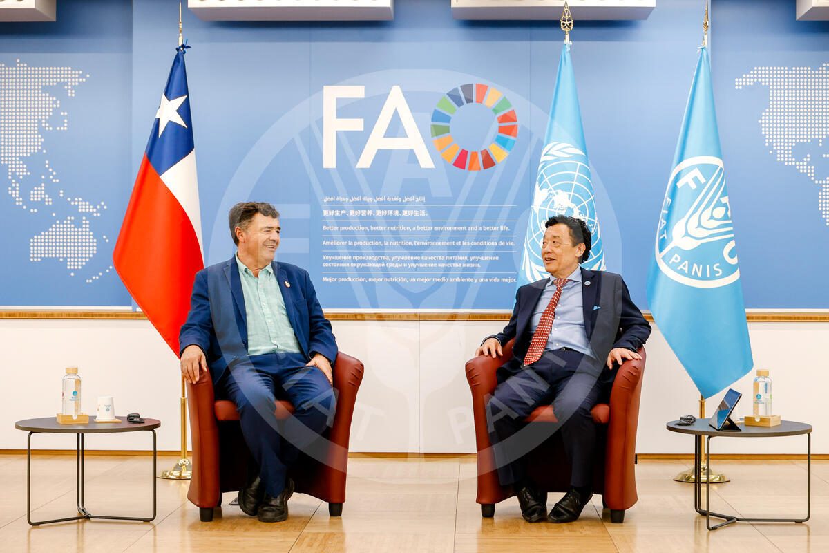 01 July 2025. Rome, Italy. FAO Director-General QU Dongyu meets Chile Minister for Agriculture Esteban Valenzuela, Van Treek. FAO headquarters (Iraq room).