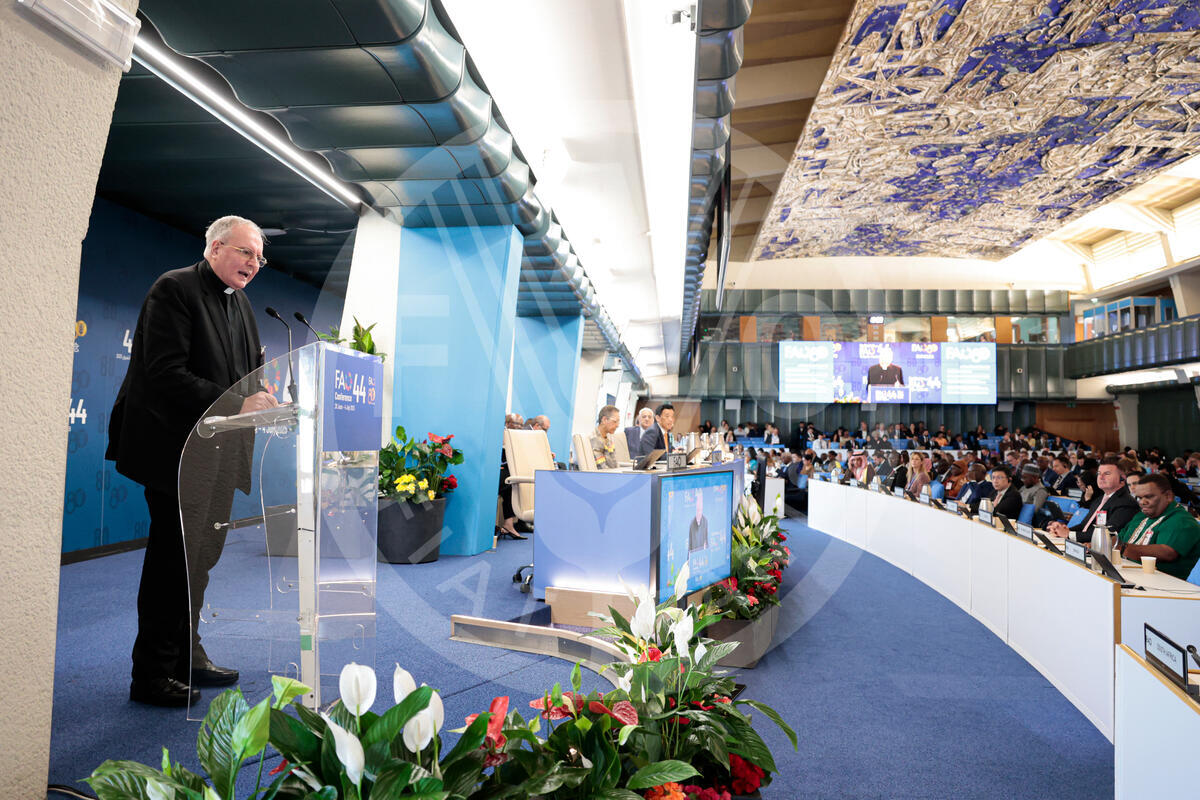 30 June 2025, Rome, Italy. Fernando Chica Arellano, Permanent Observer of the Holy See to FAO, delivers his statement during the 3rd day of the 44th Session of the FAO Conference. FAO Headquarters (Plenary Hall).