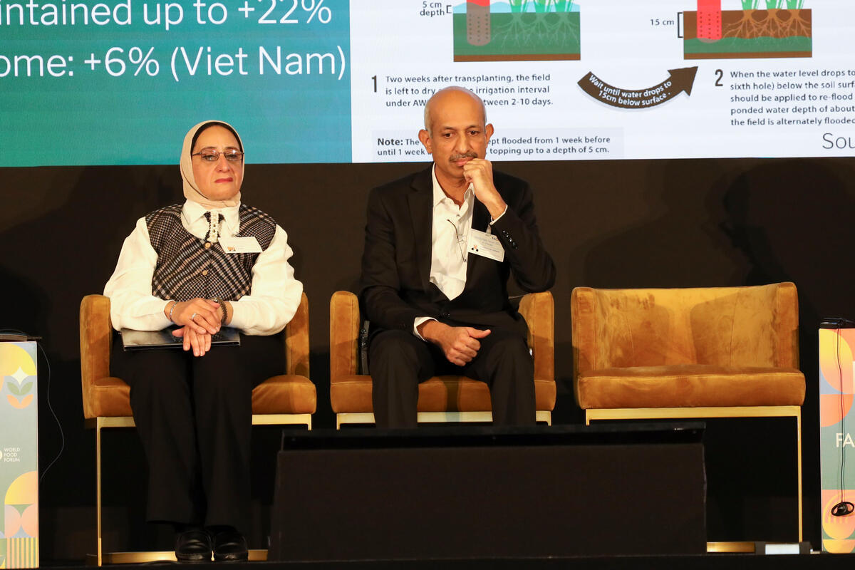 14 October 2025. FAO Headquarters, Rome, Italy. Ms Hanan Farag, Professor at the National Water Research Center (L), and Puthra G.T, Director of Agriculture Government of Karnataka (R), on the mainstage of the Rome Water Dialogue Impactful water solutions.