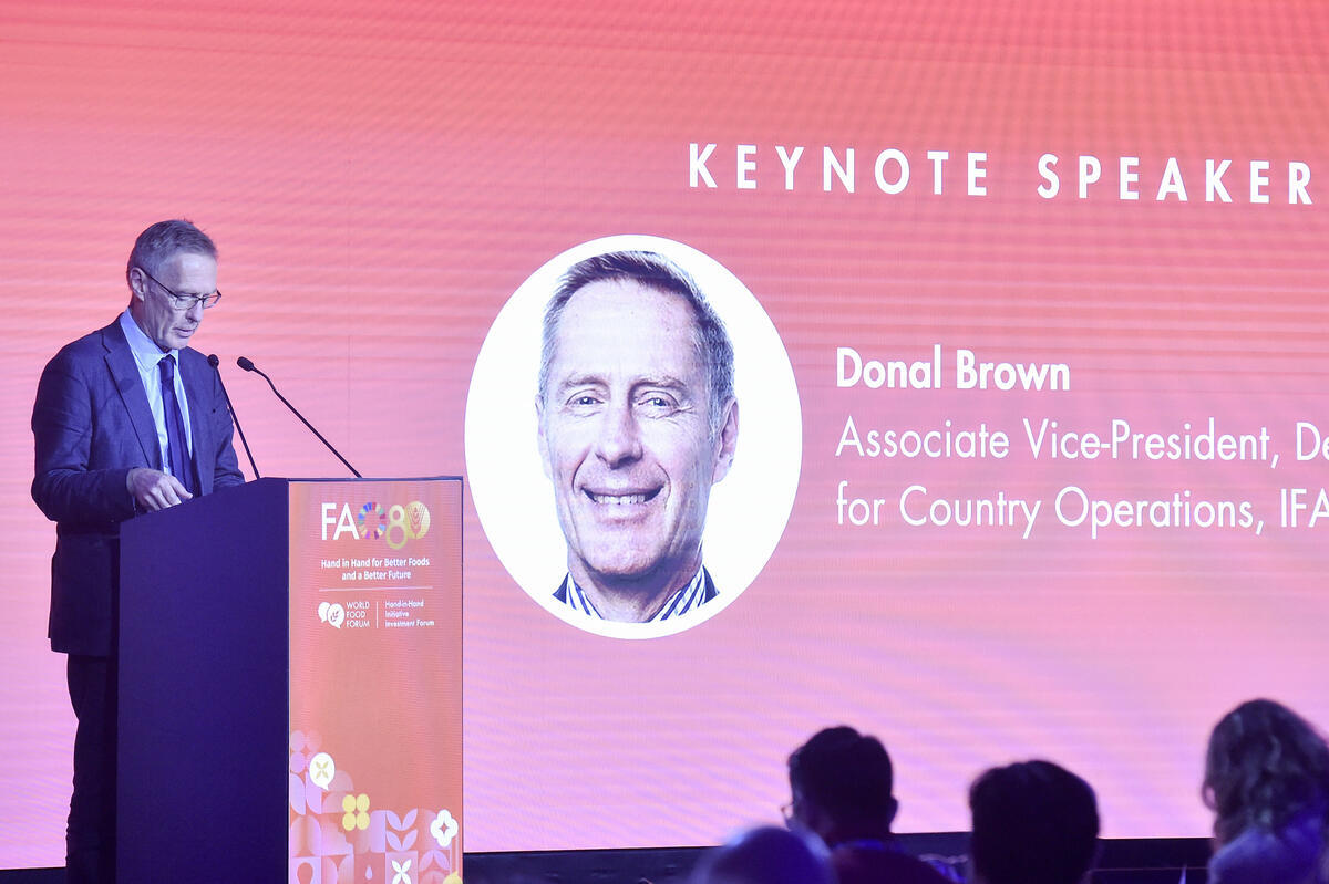 14 October 2025. FAO Headquarters, Rome, Italy. Donal Brown, Associate Vice-President of the Department for Country Operations at IFAD, speaks at the official opening ceremony of the Hand-in-Hand Initiative Investment Forum at the 2025 World Food Forum.