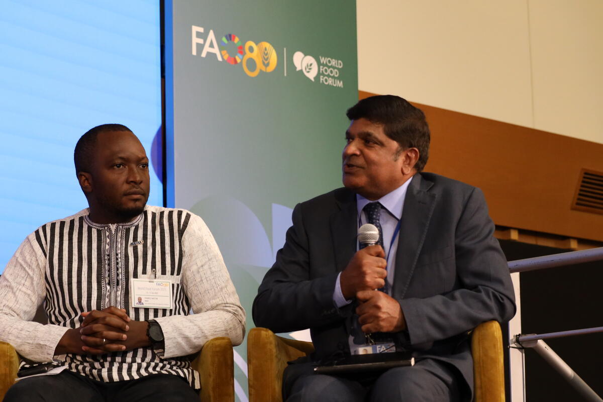 14 October 2025. FAO Headquarters, Rome, Italy. Ramasamy Selvaraju, Natural Resources Officer, FAO (R), and Moctar Dembélé, Researcher at the International Water Management Institute (L), on the mainstage of the Rome Water Dialogue Impactful water solutions.