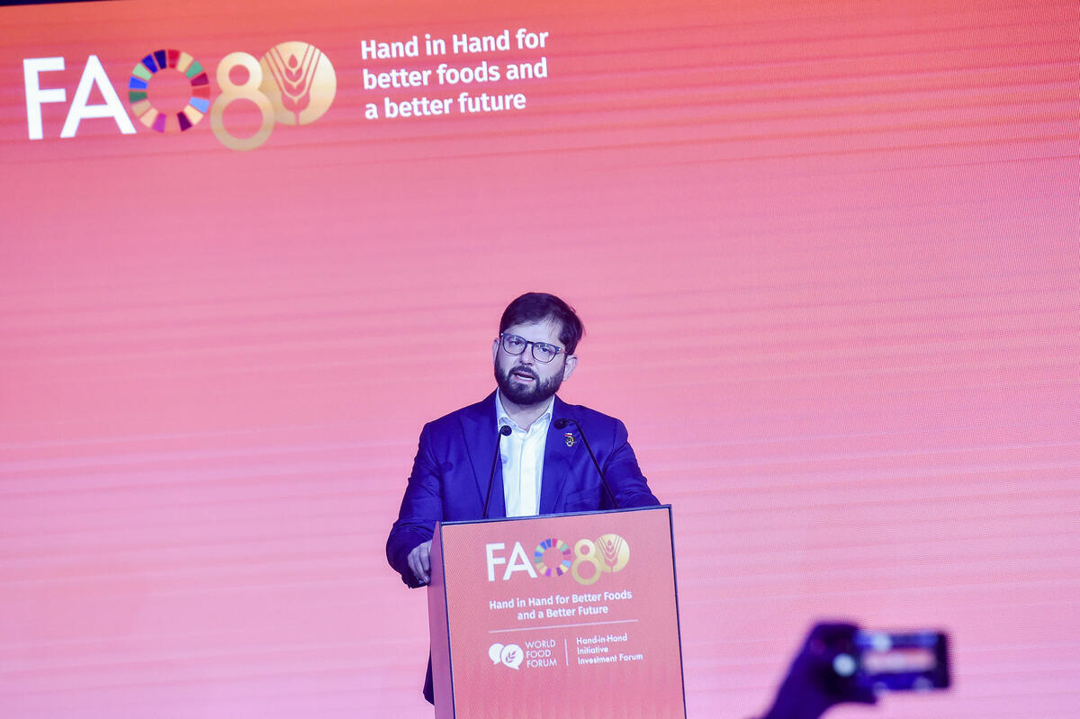 14 October, 2025. FAO Headquarters, Rome, Italy. His Excellency the President of the Republic of Chile, H.E. Gabriel Boric, speaks at the official opening ceremony of the Hand-in-Hand Initiative Investment Forum at the 2025 World Food Forum.