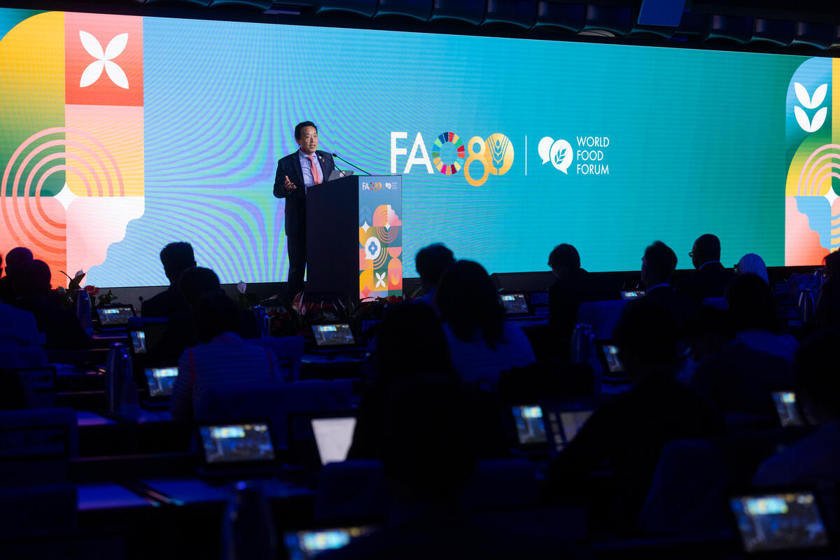 14 October 2025, Rome, Italy. FAO Director-General QU Dongyu delivers his address during the Science and Innovation Forum High-level Opening. World Food Forum (WFF) 2025. The fifth edition of the World Food Forum (WFF), the largest annual gathering of agrifood systems stakeholders globally, runs at FAO headquarters in Rome from 10 to 17 October 2025. FAO Headquarters (Plenary Hall).