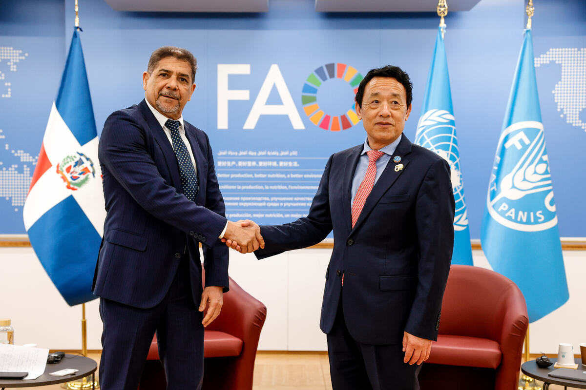 14 October 2025, Rome, Italy. FAO Director-General QU Dongyu (R) meeting with Limber Cruz López, Minister for Agriculture of the Dominican Republic.