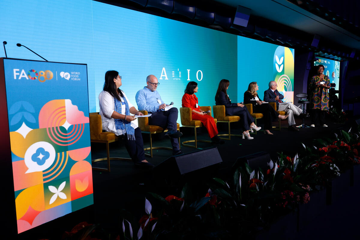 14 October 2025, Rome, Italy. Hlami Ngwenya (R) moders the Science and Innovation Forum Driving technologies and innovations towards equitable agrifood systems transformation: launching of ATIO (OIN). World Food Forum (WFF) 2025. The fifth edition of the World Food Forum (WFF), the largest annual gathering of agrifood systems stakeholders globally, runs at FAO headquarters in Rome from 10 to 17 October 2025. FAO Headquarters (Plenary Hall).