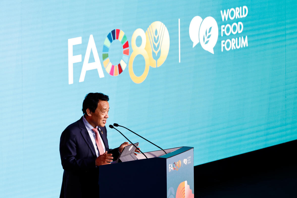 14 October 2025, Rome, Italy. FAO Director-General QU Dongyu delivers his address during the Science and Innovation Forum Driving technologies and innovations towards equitable agrifood systems transformation: launching of ATIO (OIN). World Food Forum (WFF) 2025. The fifth edition of the World Food Forum (WFF), the largest annual gathering of agrifood systems stakeholders globally, runs at FAO headquarters in Rome from 10 to 17 October 2025. FAO Headquarters (Plenary Hall).