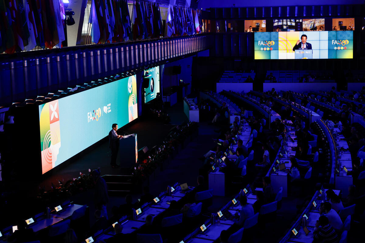 14 October 2025, Rome, Italy. FAO Director-General QU Dongyu delivers his address during the Science and Innovation Forum Driving technologies and innovations towards equitable agrifood systems transformation: launching of ATIO (OIN). World Food Forum (WFF) 2025. The fifth edition of the World Food Forum (WFF), the largest annual gathering of agrifood systems stakeholders globally, runs at FAO headquarters in Rome from 10 to 17 October 2025. FAO Headquarters (Plenary Hall).