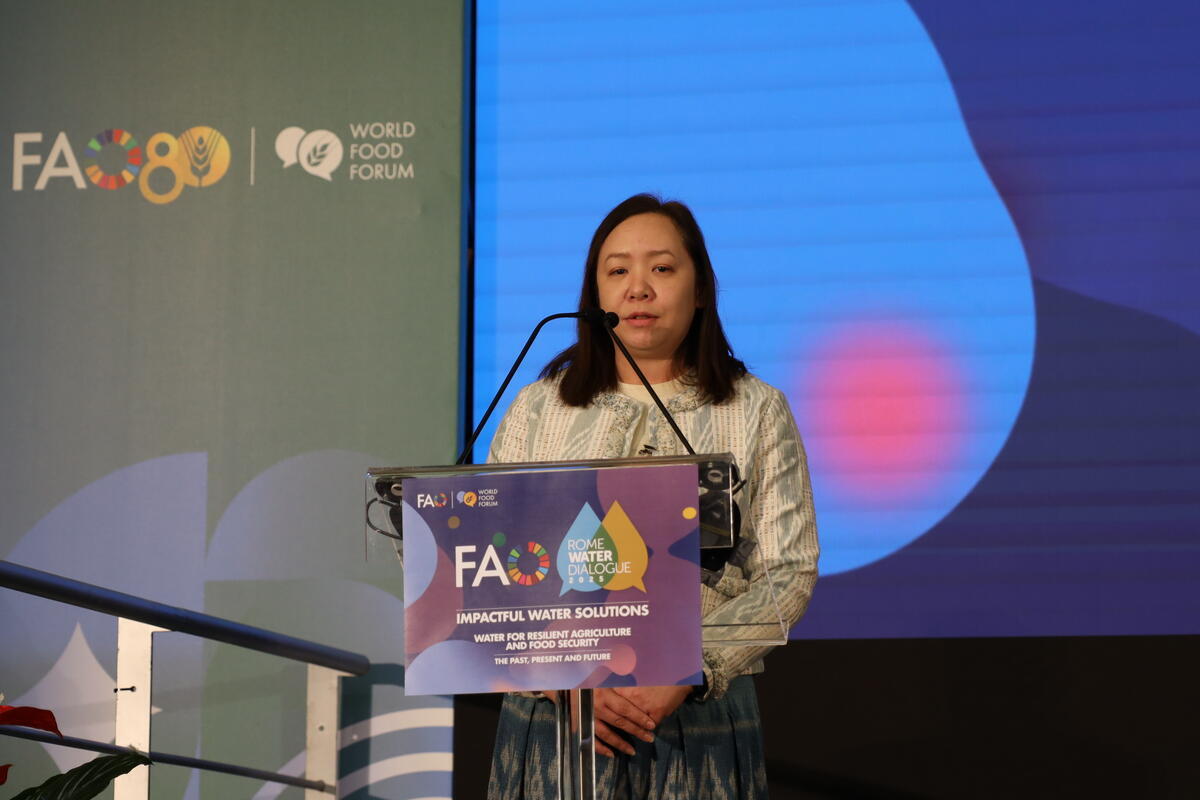 14 October 2025. FAO Headquarters, Rome, Italy. Narumon Wiangwang, Plan and Policy Analyst at the Royal Irrigation Department, presents at the Rome Water Dialogue Impactful water solutions.