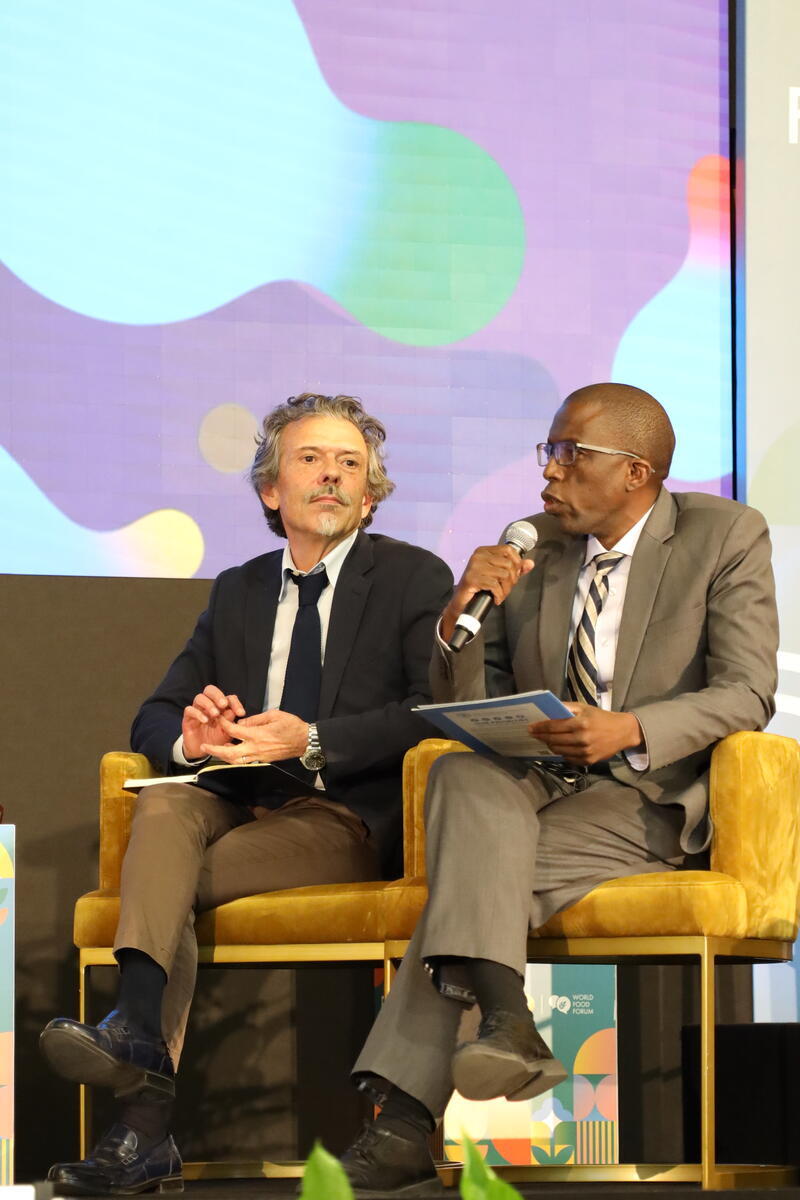 14 October 2025. FAO Headquarters, Rome, Italy. Giancarlo Pini, Climate and Earth Observation Analyst at World Food Programme (L), and Maxwell Sibhensana, Deputy Director, Operations and Resourcing, Office of Emergency and Resilience at FAO (R), on the mainstage of the Rome Water Dialogue Impactful water solutions.