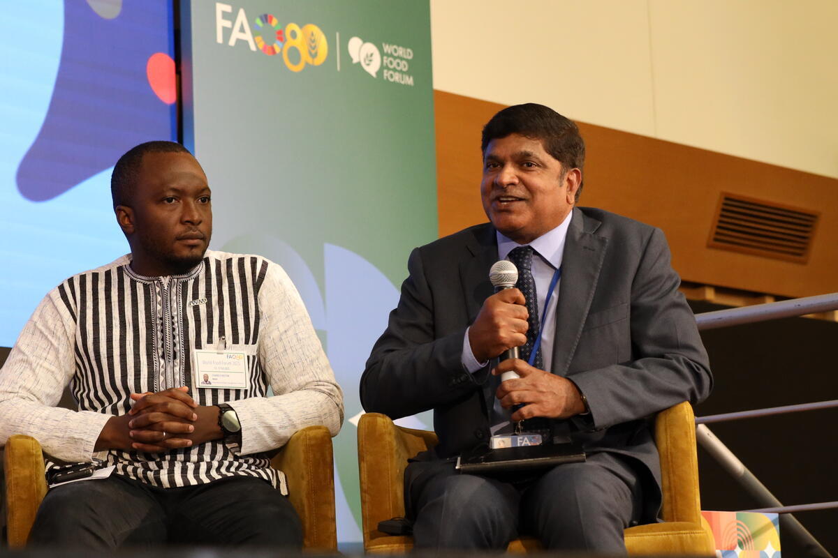 14 October 2025. FAO Headquarters, Rome, Italy. 14 October 2025. FAO Headquarters, Rome, Italy. Ramasamy Selvaraju, Natural Resources Officer, FAO (R), and Moctar Dembélé, Researcher at the International Water Management Institute (L), on the mainstage of the Rome Water Dialogue Impactful water solutions.