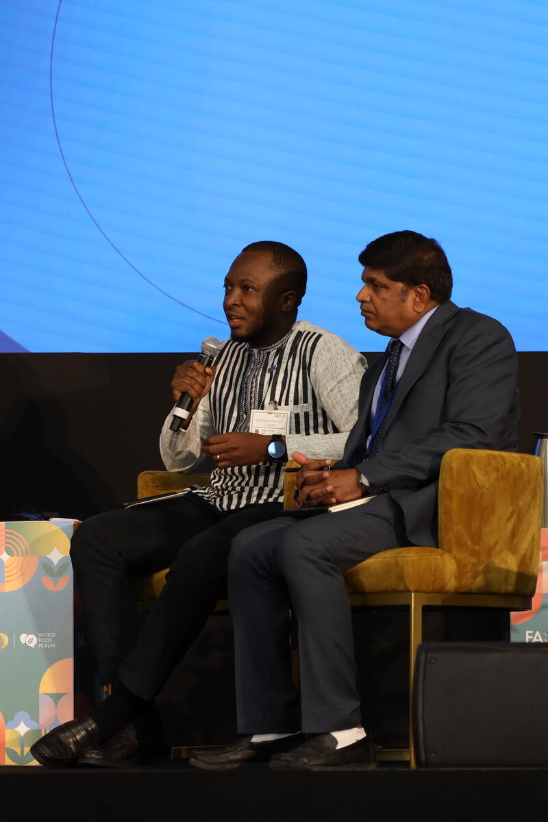 14 October 2025. FAO Headquarters, Rome, Italy. Ramasamy Selvaraju, Natural Resources Officer, FAO (R), and Moctar Dembélé, Researcher at the International Water Management Institute (L), on the mainstage of the Rome Water Dialogue Impactful water solutions.