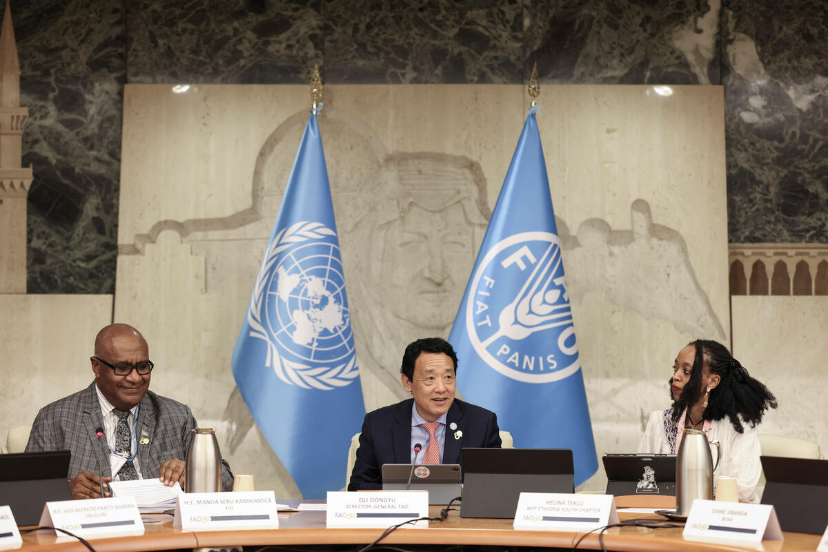 14 October 2025, Rome, Italy. FAO Director-General QU Dongyu (C), speaks during the High-Level Event on the margins of World Food Forum, Scaling up climate Response through Agrifood Systems: Sustainable and Resilient Agrifood Sustems to Deliver Better Production, Better Nutrition, Better Environment and Better Life. World Food Forum (WFF) 2025. The fifth edition of the World Food Forum (WFF), the largest annual gathering of agrifood systems stakeholders globally, runs at FAO headquarters in Rome from 10 to 17 October 2025. FAO Headquarters (King Faisal Room).