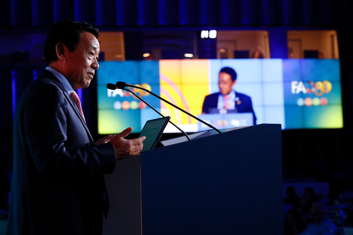 14 October 2025, Rome, Italy. FAO Director-General QU Dongyu delivers his address during the session Science and Innovation Forum Driving technologies and innovations towards equitable agrifood systems transformation: launching of ATIO (OIN). World Food Forum (WFF) 2025. The fifth edition of the World Food Forum (WFF), the largest annual gathering of agrifood systems stakeholders globally, runs at FAO headquarters in Rome from 10 to 17 October 2025. FAO Headquarters (Plenary Hall).