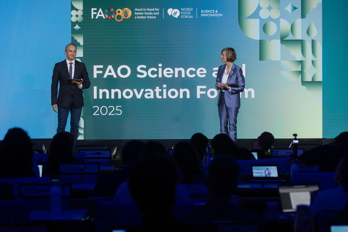 14 October 2025, Rome, Italy. Vincent Martin (L), Director of the FAO Office of Innovation (OIN), and Beth Crawford (R), FAO Chief Scientist (ad interim) and Assistant Director-General, moderate the Science and Innovation Forum High-level Opening World Food Forum (WFF) 2025.