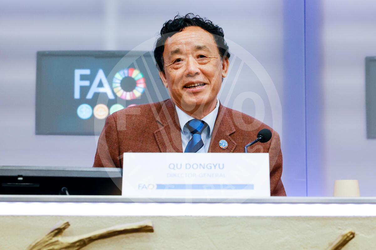 15 February 2025. Rome, Italy. FAO Director-General QU Dongyu delivers his address during the Opening Ceremony of the FAO Wellbeing Awareness Event 2025. FAO headquarters, (Sheikh Zayed Centre).