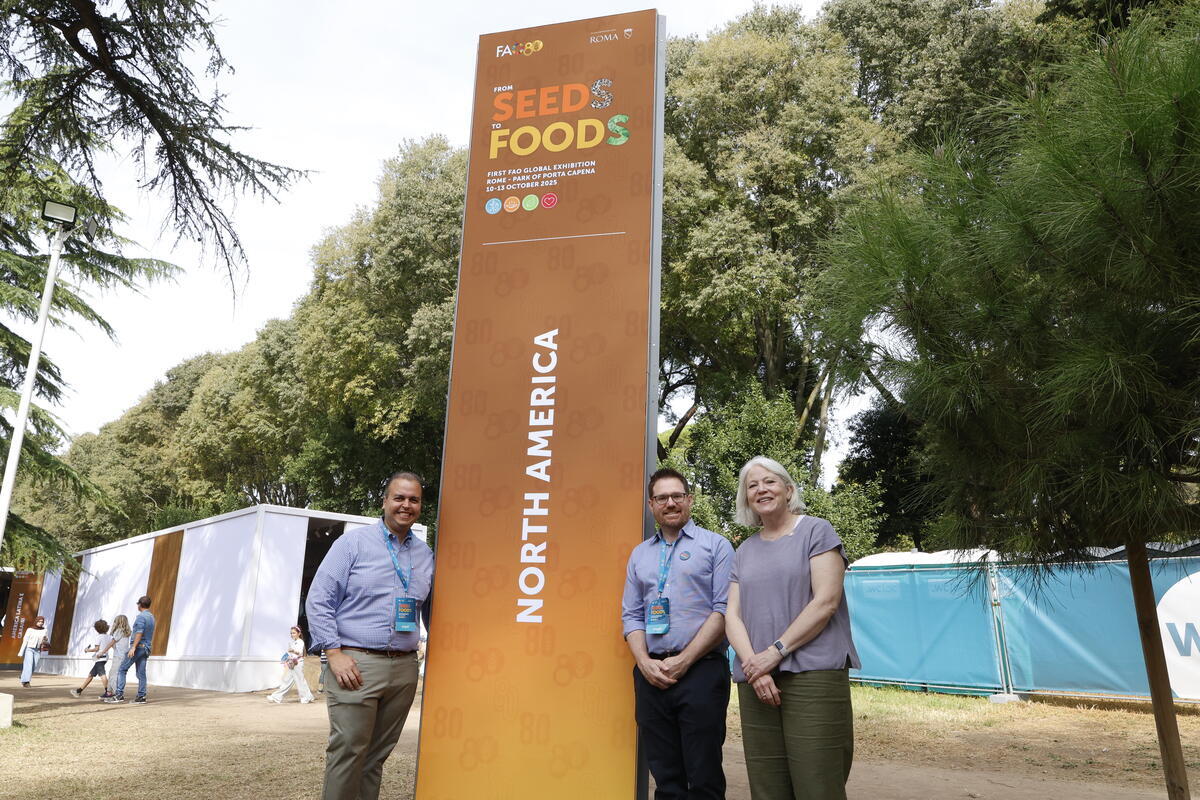 12 October 2025, Rome, Italy. (L-R) James Cordero, Knowledge Management and Information Technology Officer, Andrew Apostolopoulos, Partnership and Outreach Advisor, FAO Liaison Office for North America Jocelyn Brown Hall outside the North American Pavilion. FAO Global Exhibition: From Seeds to Foods. (Porta Capena Park). World Food Forum (WFF) 2025. The fifth edition of the World Food Forum (WFF), the largest annual gathering of agrifood systems stakeholders globally, runs at FAO headquarters in Rome from 10 to 17 October 2025.