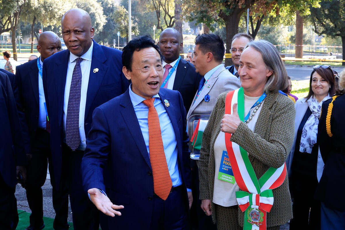 10 October 2025, Rome, Italy. From left to right: His Majesty Letsie III, King of Lesotho, FAO Director-General QU Dongyu and Rome’s Councilor to the Agriculture Development and Waste Cycle Sabrina Alfonsi. High-level opening of the FAO Global Exhibition: From Seeds to Foods. (Porta Capena Park). World Food Forum (WFF) 2025. The fifth edition of the World Food Forum (WFF), the largest annual gathering of agrifood systems stakeholders globally, runs at FAO headquarters in Rome from 10 to 17 October 2025.