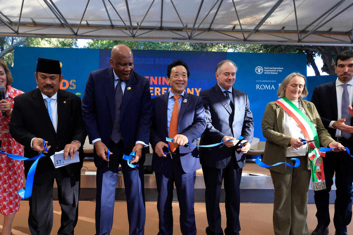 10 October 2025, Rome, Italy. From left to right: Indonesia’s Minister for National Development Planning Rachmat Pambudy, Lesotho’s King Letsie III, FAO Director-General QU Dongyu, Permanent Representative of Italy to the United Nations Organizations in Rome Bruno Archi, Rome’s Councilor to the Agriculture Development and Waste Cycle Sabrina Alfonsi. High-level opening of the FAO Global Exhibition: From Seeds to Foods. (Porta Capena Park). World Food Forum (WFF) 2025. The fifth edition of the World Food Forum (WFF), the largest annual gathering of agrifood systems stakeholders globally, runs at FAO headquarters in Rome from 10 to 17 October 2025.
