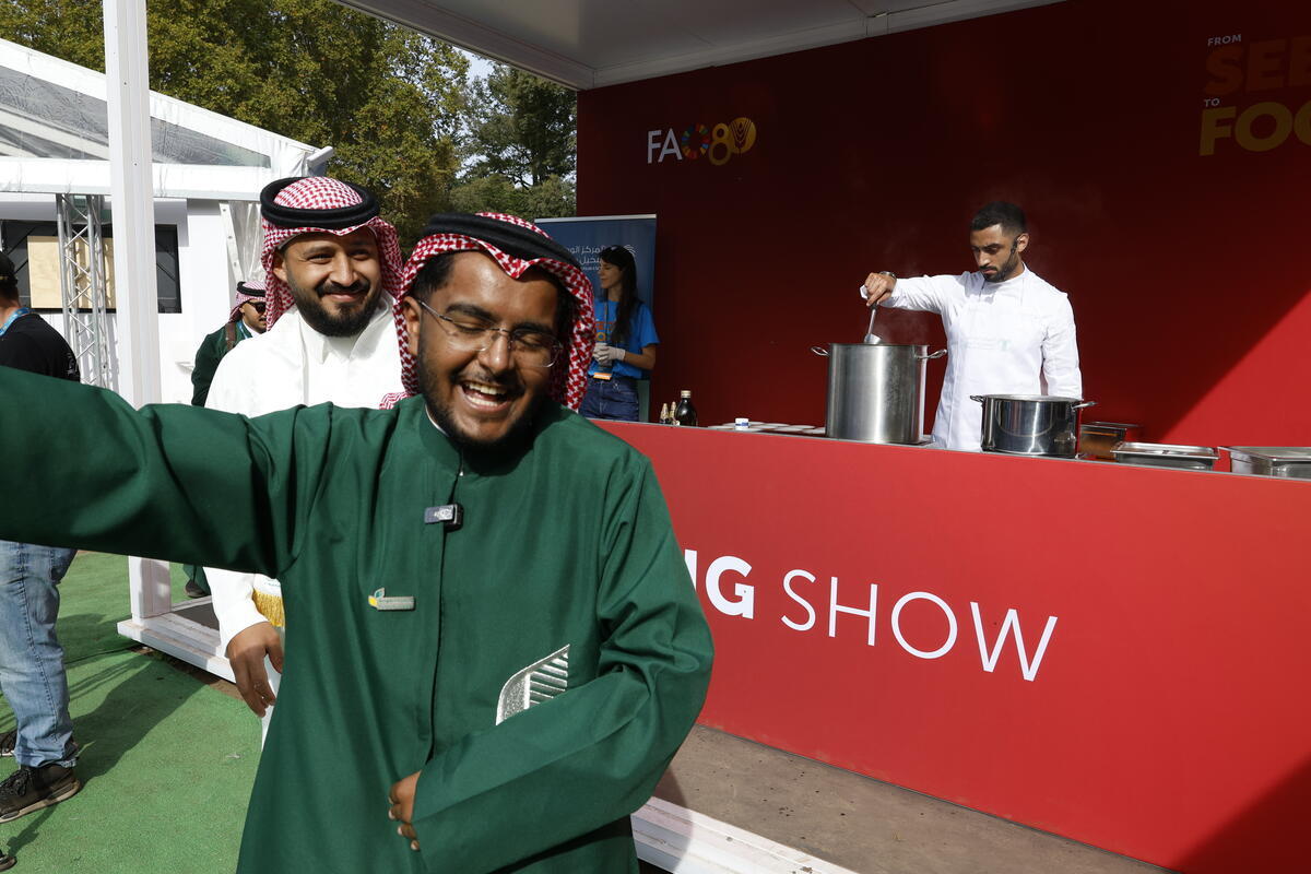 12 October 2025, Rome, Italy. Men dance the traditional Al-Ardha Saudi during the cooking show led by Chef Ammar, National Center for Palms and Dates, Saudi Arabia. FAO Global Exhibition: From Seeds to Foods. (Porta Capena Park). World Food Forum (WFF) 2025. The fifth edition of the World Food Forum (WFF), the largest annual gathering of agrifood systems stakeholders globally, runs at FAO headquarters in Rome from 10 to 17 October 2025.