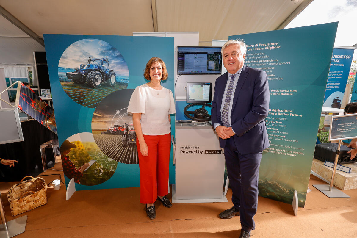 11 October 2025, Rome, Italy. Beth Bechdol, Deputy Director-General, FAO and Carlo Lambro, Vice president CEMA stand for a photo at the FAO Global Exhibition: From Seeds to Foods. (Porta Capena Park).