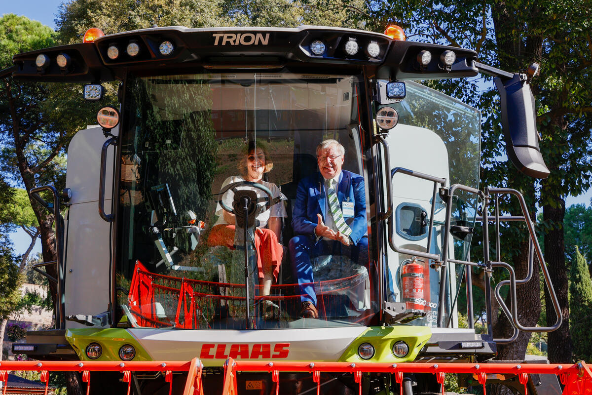 11 October 2025, Rome, Italy. Beth Bechdol, Deputy Director-General, FAO sits next to Klaus Herbert Rolf, Communication Coordinator CLAAS / CEMA inside a combine harvester at the FAO Global Exhibition: From Seeds to Foods. (Porta Capena Park).