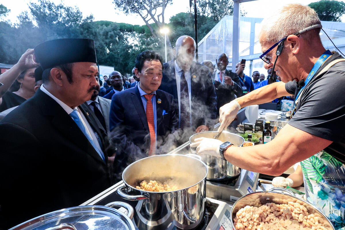 10 October 2025, Rome, Italy. FAO Director-General QU Dongyu attends the show cooking of Max Mariola at the FAO Global Exhibition: From Seeds to Foods. (Porta Capena Park). World Food Forum (WFF) 2025. The fifth edition of the World Food Forum (WFF), the largest annual gathering of agrifood systems stakeholders globally, runs at FAO headquarters in Rome from 10 to 17 October 2025.