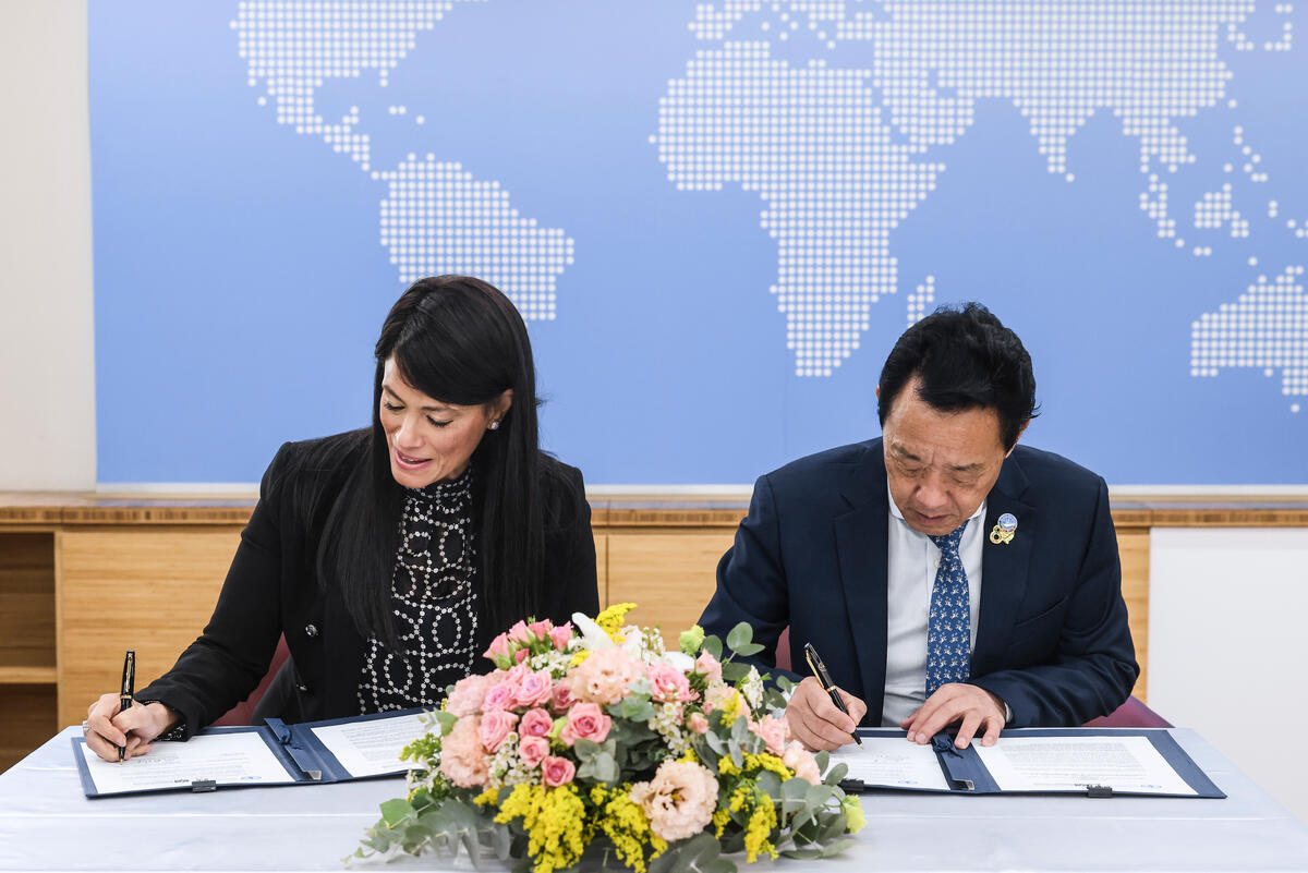 13 October 2025, Rome, Italy. FAO Director-General QU Dongyu (R) and Egypt Minister for Planning, Economic Development and International Cooperation (MOIC) Rania Al-Mashat (L) sign a letter of intent between the Food and Agriculture Organisation of the United Nations and the Ministry for Planning, Economic Development and International Cooperation (MOIC). FAO Headquarters. (Iraq room).