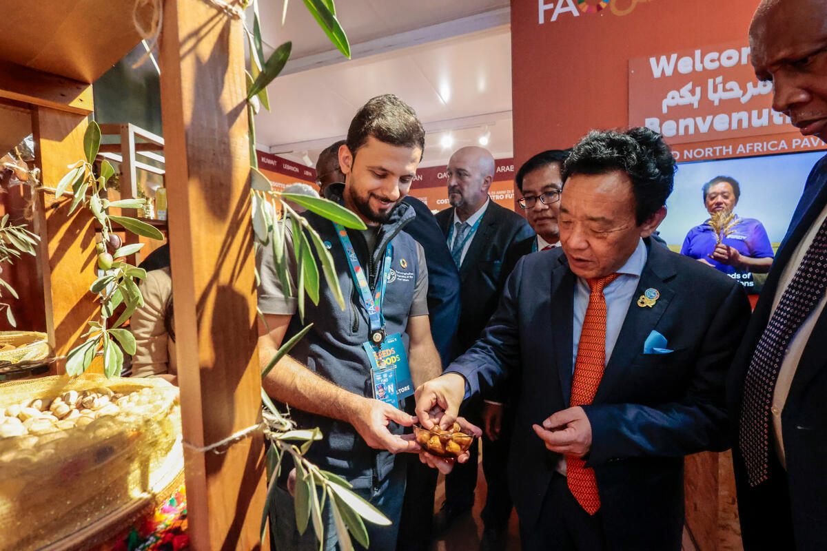 October 10, 2025, Rome, Italy. FAO Director-General QU Dongyu (C) visits the NENA stand at the FAO Global Exhibition: From Seeds to Food (Porta Capena Park). World Food Forum (WFF) 2025. The fifth edition of the World Food Forum (WFF), the largest annual gathering of global agri-food system stakeholders, will be held at FAO Headquarters in Rome from October 10 to 17, 2025.