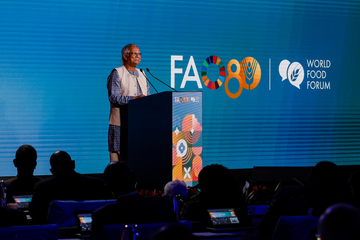 13 October 2025, Rome, Italy. Bangladesh Chief Adviser Muhamad Yunus delivers his speech at the World Food Forum (WFF) 2025 Grand Opening. World Food Forum (WFF) 2025 Grand Opening. The fifth edition of the World Food Forum (WFF), the largest annual gathering of agrifood systems stakeholders globally, runs at FAO headquarters in Rome from 10 to 17 October 2025. FAO Headquarters (Plenary Hall).