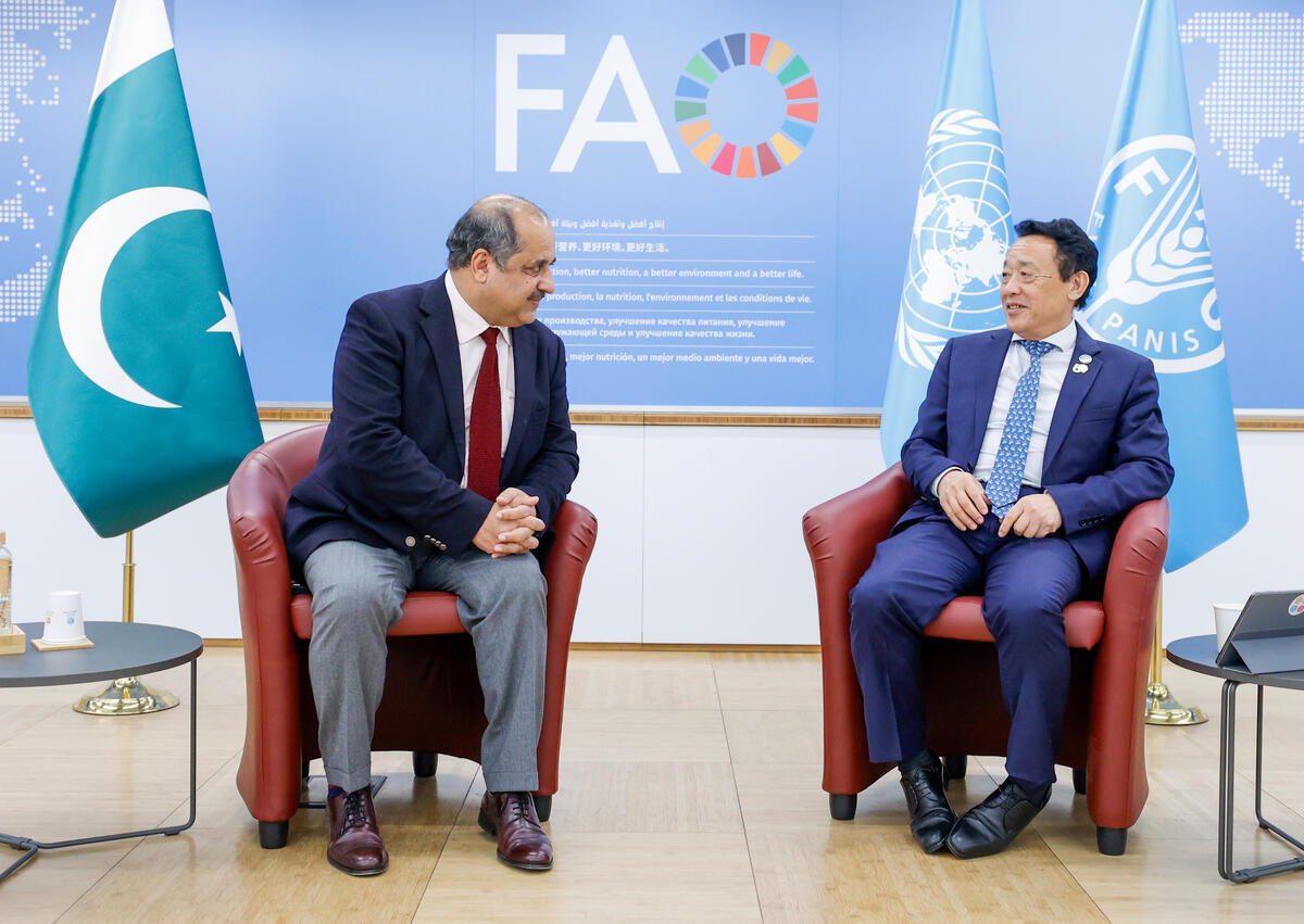 13 October 2025, Rome, Italy - FAO Director-General QU Dongyu meeting Pakistan Advisor to Prime Minister - Syed Tauqir Hussain Shah. FAO Headquarters (Iraq Room)