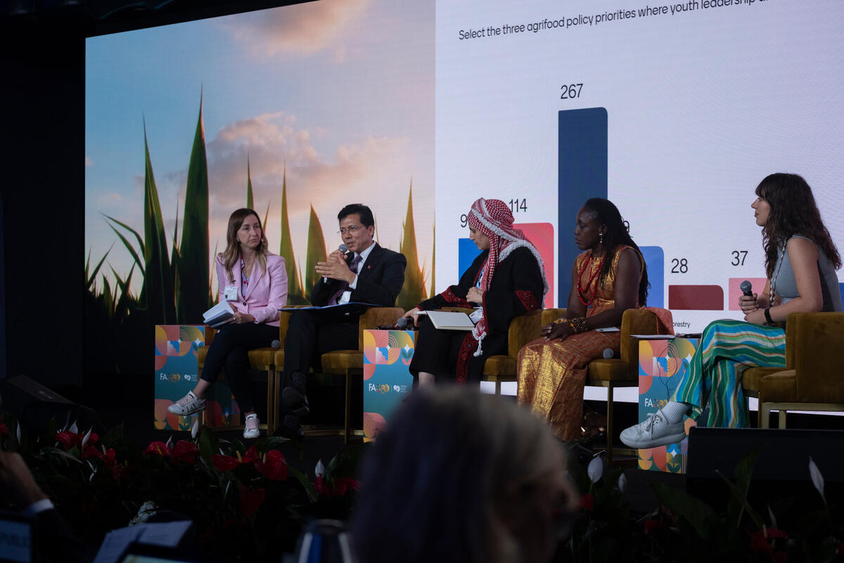 13 October, 2025. FAO Headquarters, Rome, Italy. From left to right: Nicoletta Merlo, Head of Youth Policies at CISL; His Excellency Lok Bahadur Thapa, President of the 2026 session of the Economic and Social Council; Rand Alkhushman, Board Member of the WFF Youth Policy; Alberta Nana Akyaa Akosa, Founder of Agrihouse Foundation and Leader of WFF Ghana; Natasja Holscher, UN Youth Representative Biodiversity and Food, attend the Global Youth Forum Opening Ceremony at World Food Forum 2025.