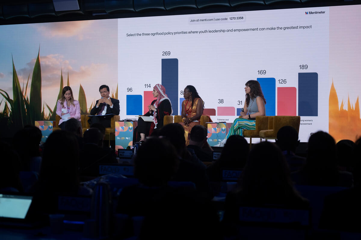 13 October, 2025. FAO Headquarters, Rome, Italy. From left to right: Nicoletta Merlo, Head of Youth Policies at CISL; His Excellency Lok Bahadur Thapa, President of the 2026 session of the Economic and Social Council; Rand Alkhushman, Board Member of the WFF Youth Policy; Alberta Nana Akyaa Akosa, Founder of Agrihouse Foundation and Leader of WFF Ghana; Natasja Holscher, UN Youth Representative Biodiversity and Food, attend the Global Youth Forum Opening Ceremony at World Food Forum 2025.