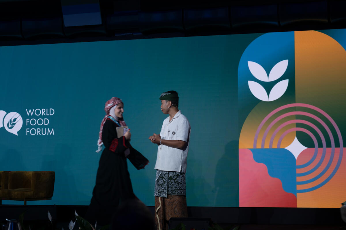 13 October, 2025. FAO Headquarters, Rome, Italy. Rizka Afif, Co-leader of the WFF Indonesia Chapter, and Rand Alkhushman, member of the WFF Youth Policy Board, on the mainstage at the Global Youth Forum Opening Ceremony at World Food Forum 2025.