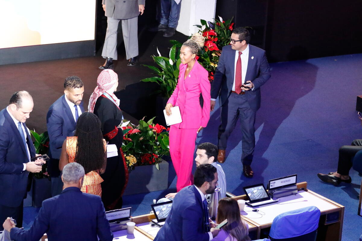 H.E Lesego Chimbo, Botswana's Minister of Youth and Gender Affairs, meets Rand Alkhushman, World Food Forum Youth Policy Board Member during the Global Youth Forum Opening Ceremony.