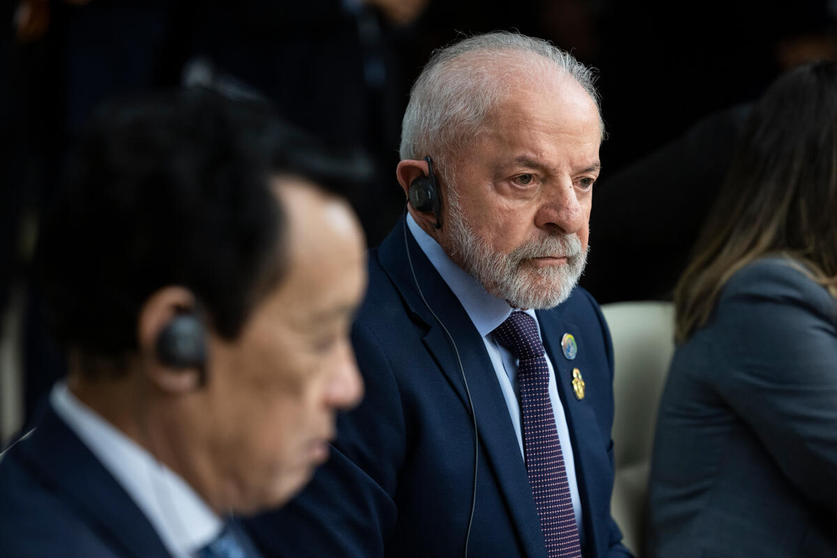 13 October 2025, Rome, Italy. FAO Director-General QU Dongyu (L) and President of Brazil Luiz Inácio Lula da Silva (R) listen to an address during the Board of Champions of the Global Alliance against Hunger and Poverty event.
