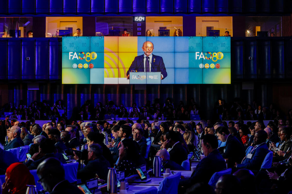 13 October 2025, Rome, Italy. Luiz Inácio Lula da Silva , President of Brazil delivers his speech at the World Food Forum (WFF) 2025 Grand Opening. The fifth edition of the World Food Forum (WFF), the largest annual gathering of agrifood systems stakeholders globally, runs at FAO headquarters in Rome from 10 to 17 October 2025. FAO Headquarters (Plenary Hall).